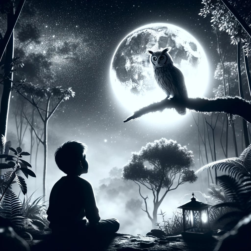 Guidé par le lointain hulullement d’un hibou, son esprit d’aventure l’emporte loin de la sécurité de la cave, ses petits pieds le menant à travers les ombres mouvantes de la forêt nocturne. Sa famille, est prise d’une panique silencieuse. Leur recherche désespérée les conduit finalement à une clairière où Lucas, émerveillé, observe le hibou perché sur une branche, baigné dans la lumière argentée de la pleine lune. L’image, bien que paisible, frappe la famille avec la force d’un coup de tonnerre : ils sont exposés, vulnérables sous le regard de la lune, un phare pour les créatures qui guettent dans l’obscurité.