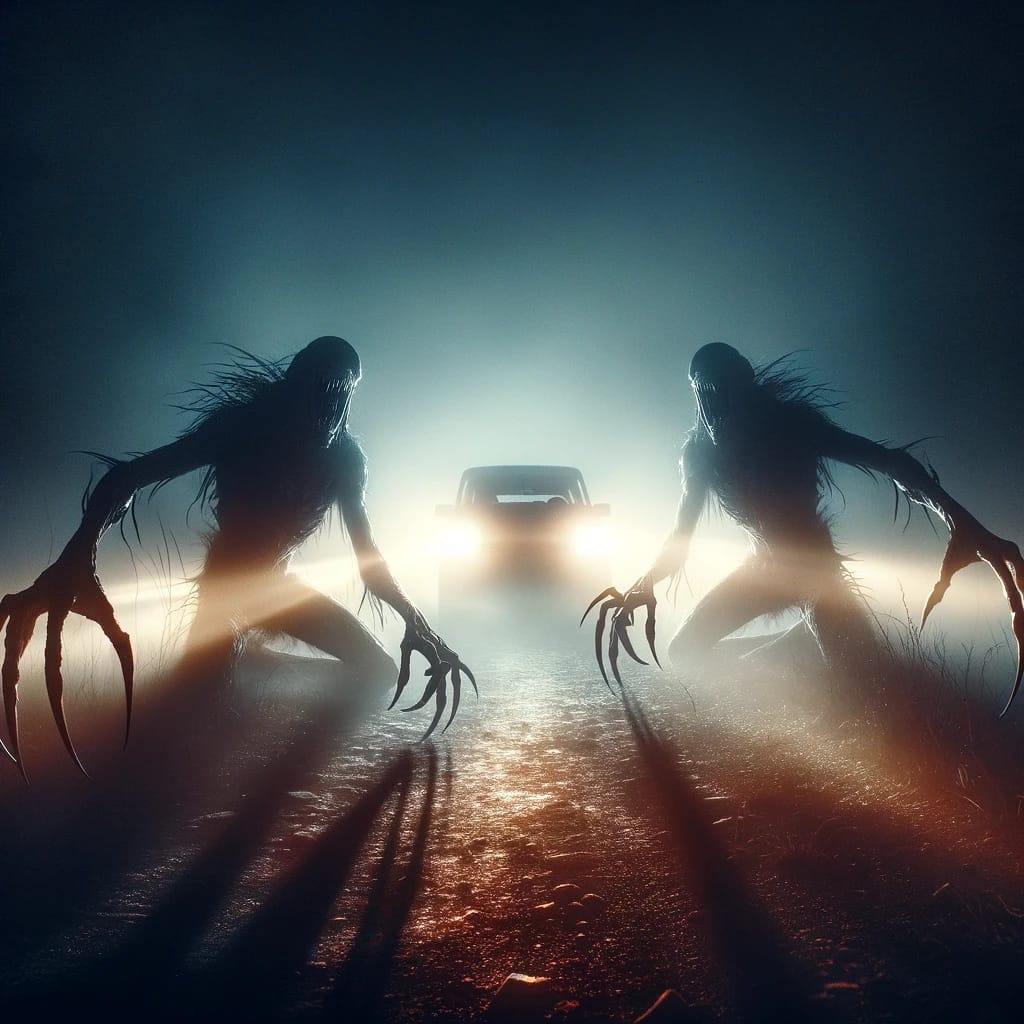 C’est alors, dans ce moment de terreur absolue, qu’un coup de klaxon déchire la nuit, suivi par [simple_tooltip content=’A buzzing or humming sound, usually associated with the noise of machinery or engines.’]le vrombissement[/simple_tooltip] d’un moteur. Un grand flash de lumière traverse brièvement l’obscurité, captant l’attention des créatures avec une force irrésistible. Le son des pneus crissant contre le sol et le rugissement du moteur s’éloignent dans la nuit, emportant avec eux les hurlements furieux des créatures, une marée de rage frustrée poursuivant La Sentinelle sans relâche.