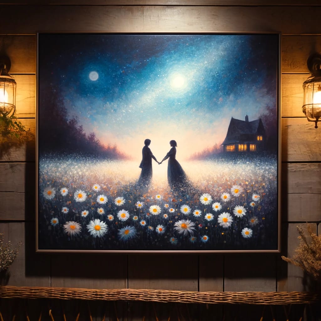 Dans un geste d’amour profond, Élise avait ensuite conduit Louise vers l’arrière de la maison. Sous la bâche se trouvait un grand tableau qu’Élise avait peint. Il représentait un champ de [simple_tooltip content=’Daisies, simple yet cheerful flowers, often symbolizing innocence and the joy of the ordinary.’]pâquerettes[/simple_tooltip] sous un ciel étoilé, un lieu de leur enfance où elles avaient rêvé et partagé tant de moments joyeux. Au centre, deux silhouettes se tenaient la main, leurs ombres se mélangeant avec les fleurs et les étoiles.